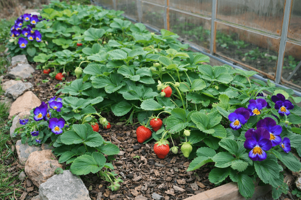 Violas should be planted in the corners of the strawberry bed or in open spaces around the strawberries so the pollinators know where to go.