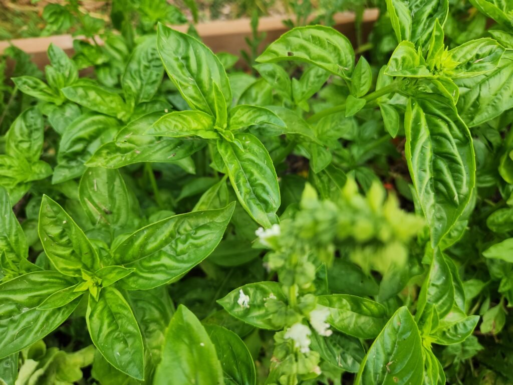 We only grow Genovese basil. This is the type you will find at the grocery store. It’s the best variety for eating and it’s well known for it aromatic scent which helps in deterring those pesky bugs.
