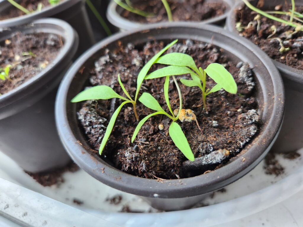 There are three seedlings sharing this four inch container and we’ll let them grow a little bigger before thinning them down to one.
