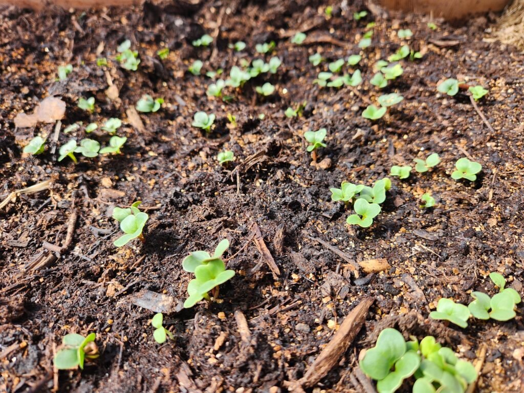 In our greenhouse we have bunch of sprouts popping up. Our radishes that we planted, from seeds we saved last fall, have germinated really well.